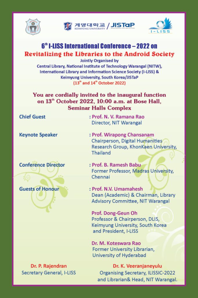 รศ.ดร.วิระพงศ์ จันทร์สนาม ประธานกรรมการบริหารกลุ่มวิจัยมนุษยศาสตร์ดิจิทัล (DHRG) ได้รับเชิญให้ไปเป็น Keynote speaker ในการประชุมวิชาการ the 6th I-LISS international conference-2022 ระหว่างวันที่ 13-14 ตุลาคม 2565 ณ National Institute of Technology Warangal เมือง Warangal ประเทศอินเดีย ซึ่งจัดโดยสมาคม International Library and Information Science Society ร่วมกับ National Institute of Technology Warangal (อินเดีย) และ Keimyung University/JISTaP (เกาหลีใต้) โดยในงานได้นำเสนอหัวข้อ “Advanced technology for digital archive research”